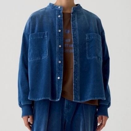バンドカラーシャツをベースに袖口に同色系リブを配したデザイン。前身頃は短かめの丈でワイドボトムとも合わせやすく、後身頃はヒップ下までしっかり覆う長めの設定で気になる部分をカバーします。シャツジャケットとして、秋から春先まで幅広いシーズンで活躍する一着です。同素材のパンツとのセットアップコーデも可能です。