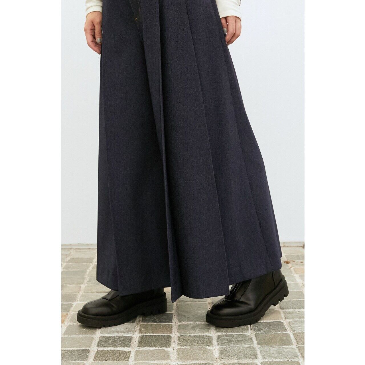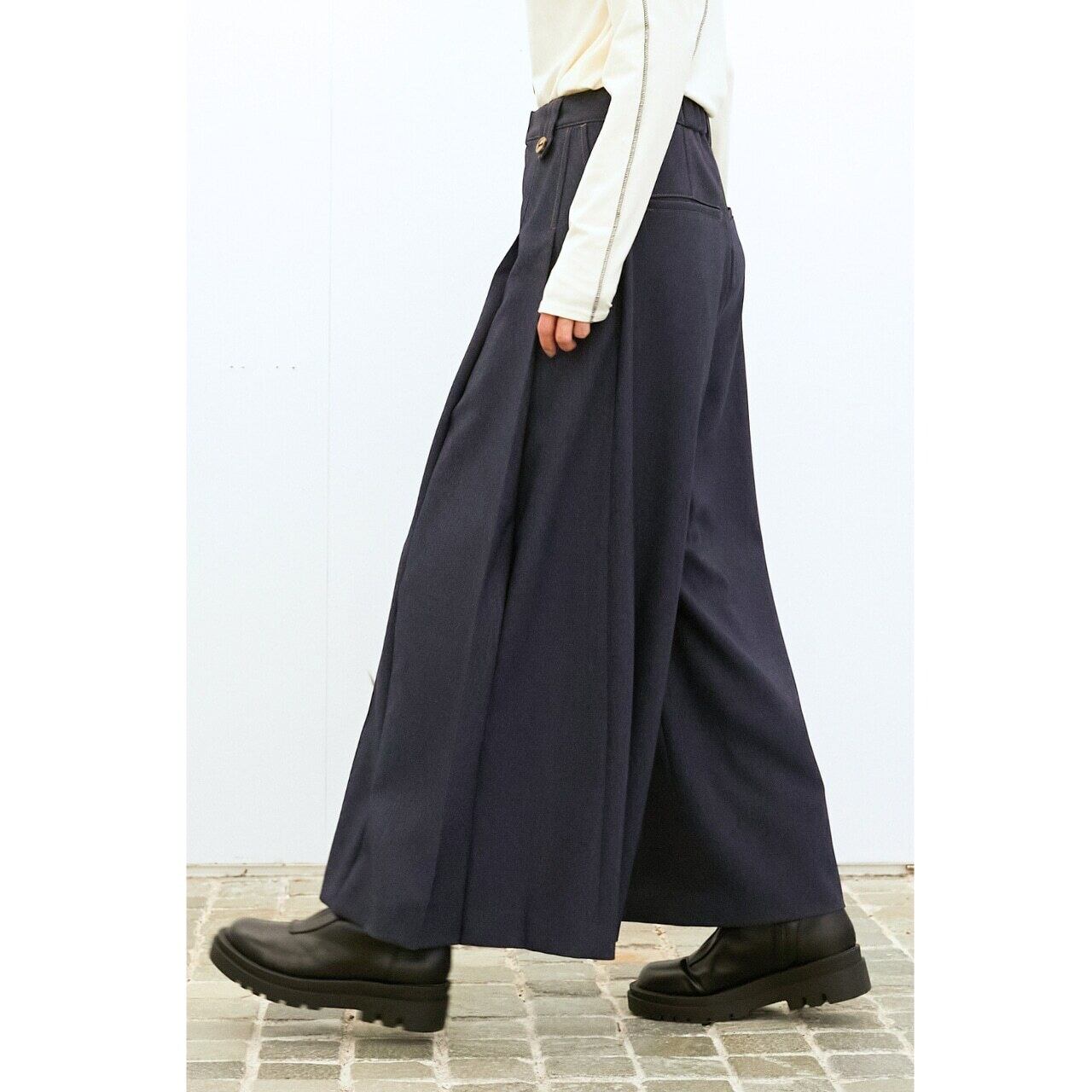 贅沢に生地を使用した立体的なタックプリーツがポイント。動くたびに美しいドレープが広がり、モード感のある着こなしに。