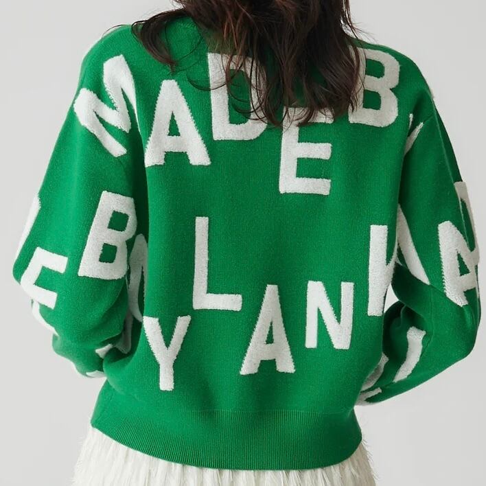 配色部分をさがら刺繍のループ状に仕上げ、立体感を出したジャガードトップス。大きめのロゴ「MADE BY MYLANKA」がキャッチーで、着るだけで存在感のある一枚に。遊び心と上品さを兼ね備えたデザインです。