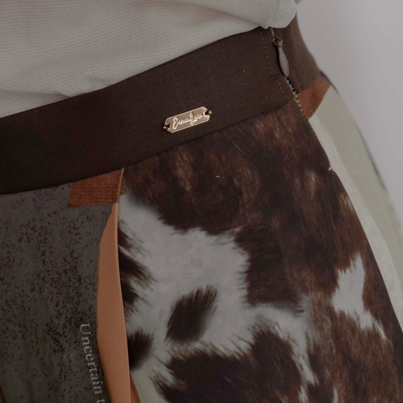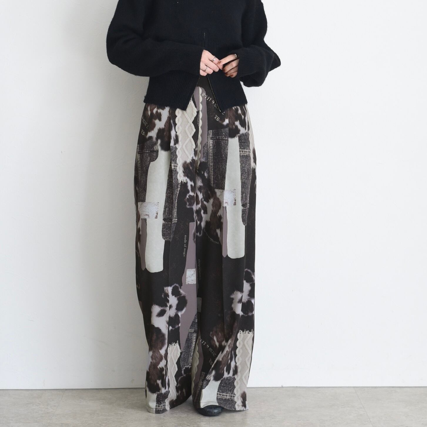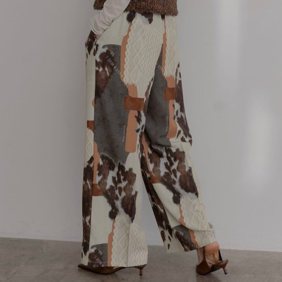 トレンドのアニマル柄やデニム、ケーブルニットをひとつひとつ切り取ってコラージュしたオリジナルプリントパンツ。