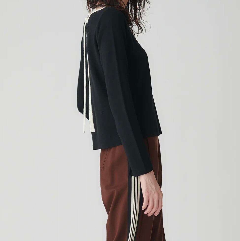 シルク混で上品な光沢感と滑らかな肌触りが特徴です。セットインスリーブのすっきりとしたシルエットで着回しやすく、背中に垂れる配色リボンが女性らしいアクセントになっています。