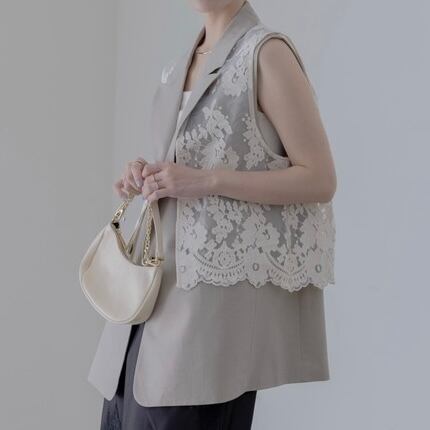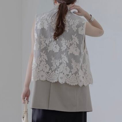 カジュアルからシンプルまで幅広く万能ベストにオーガンジー刺繡ジレを合わせた存在感ある一枚。レースジレが抜け感をプラスしてくれ気取らずにお召し頂けます。それぞれ別々でも着用できます。