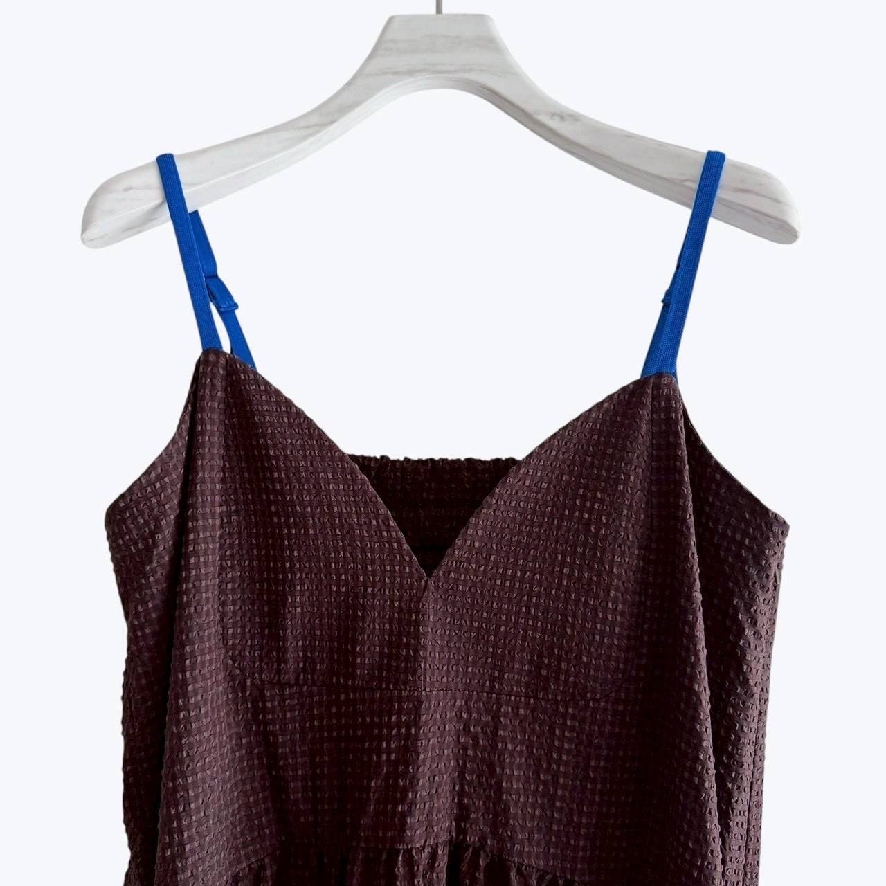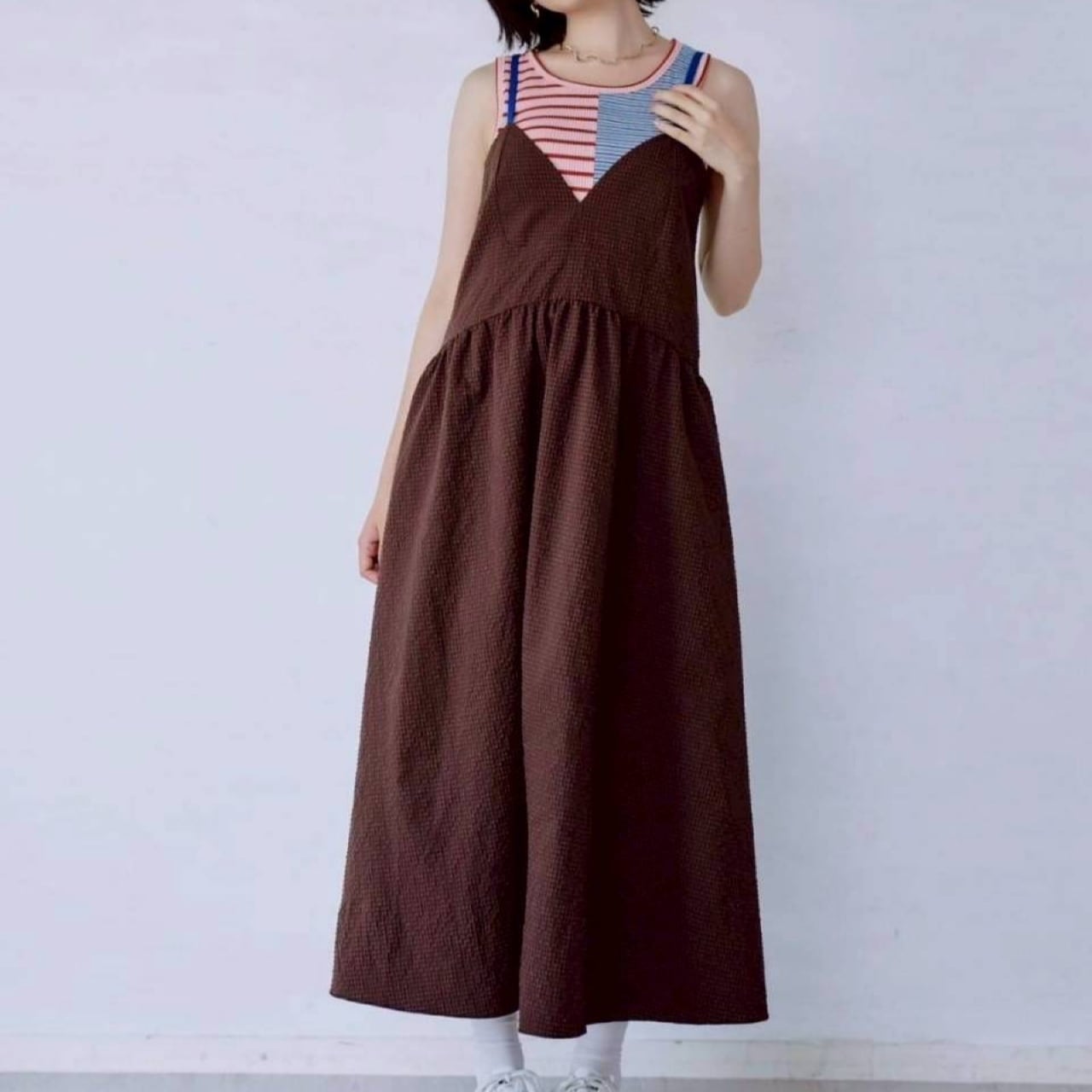 細かなチェック柄に配色肩紐が映えるキャミワンピース。背中にはゴム仕様でリラックス感。着丈はアジャスターで調節可能。