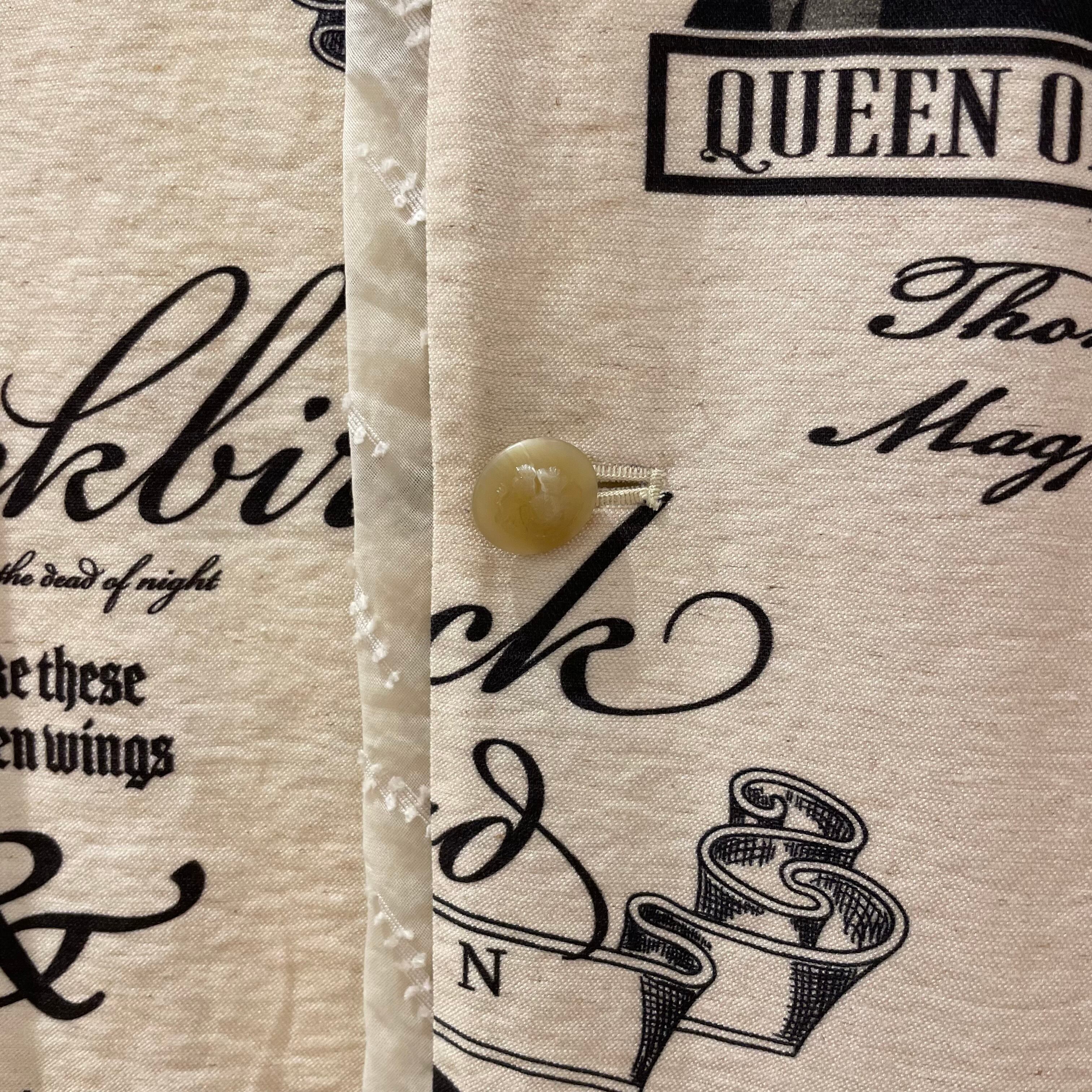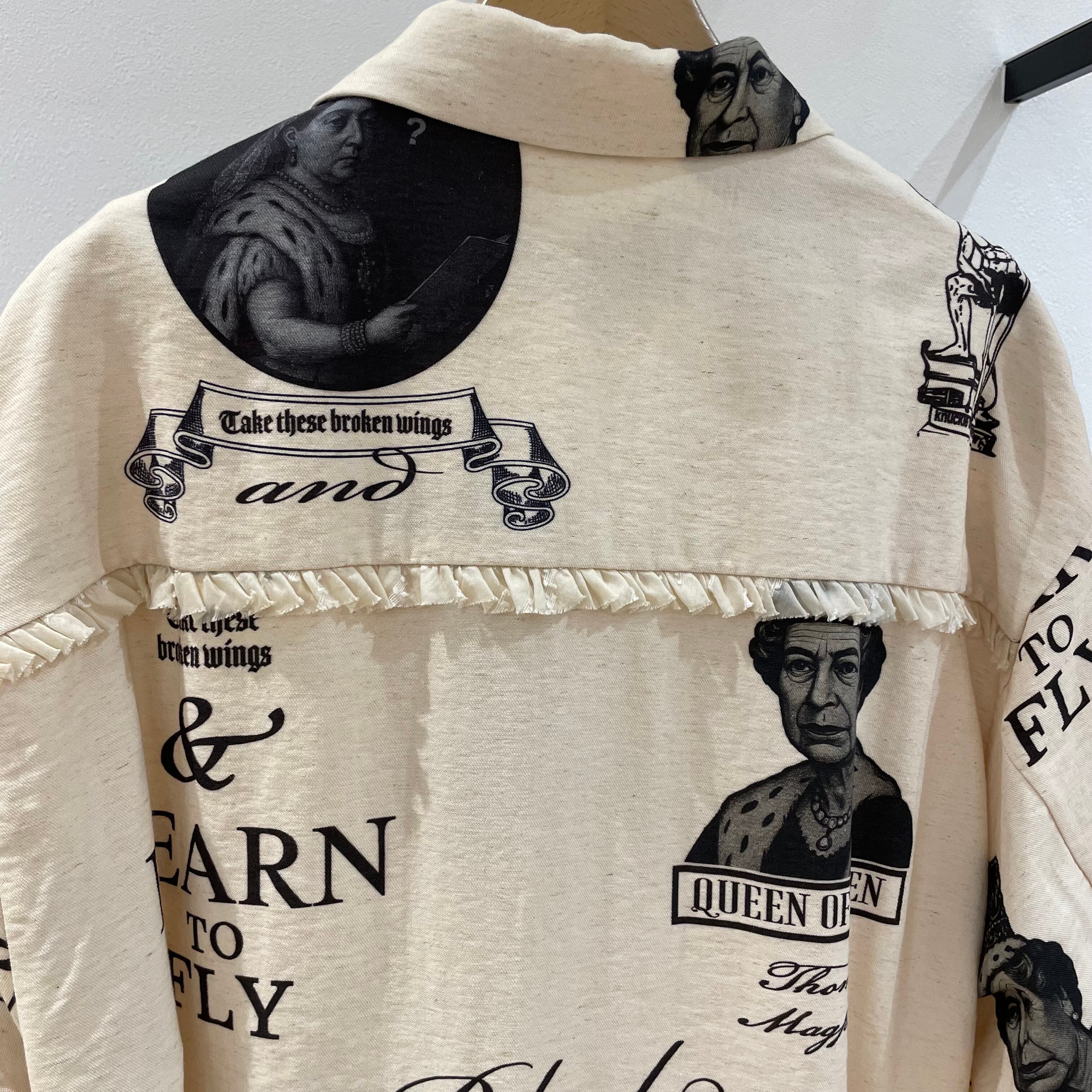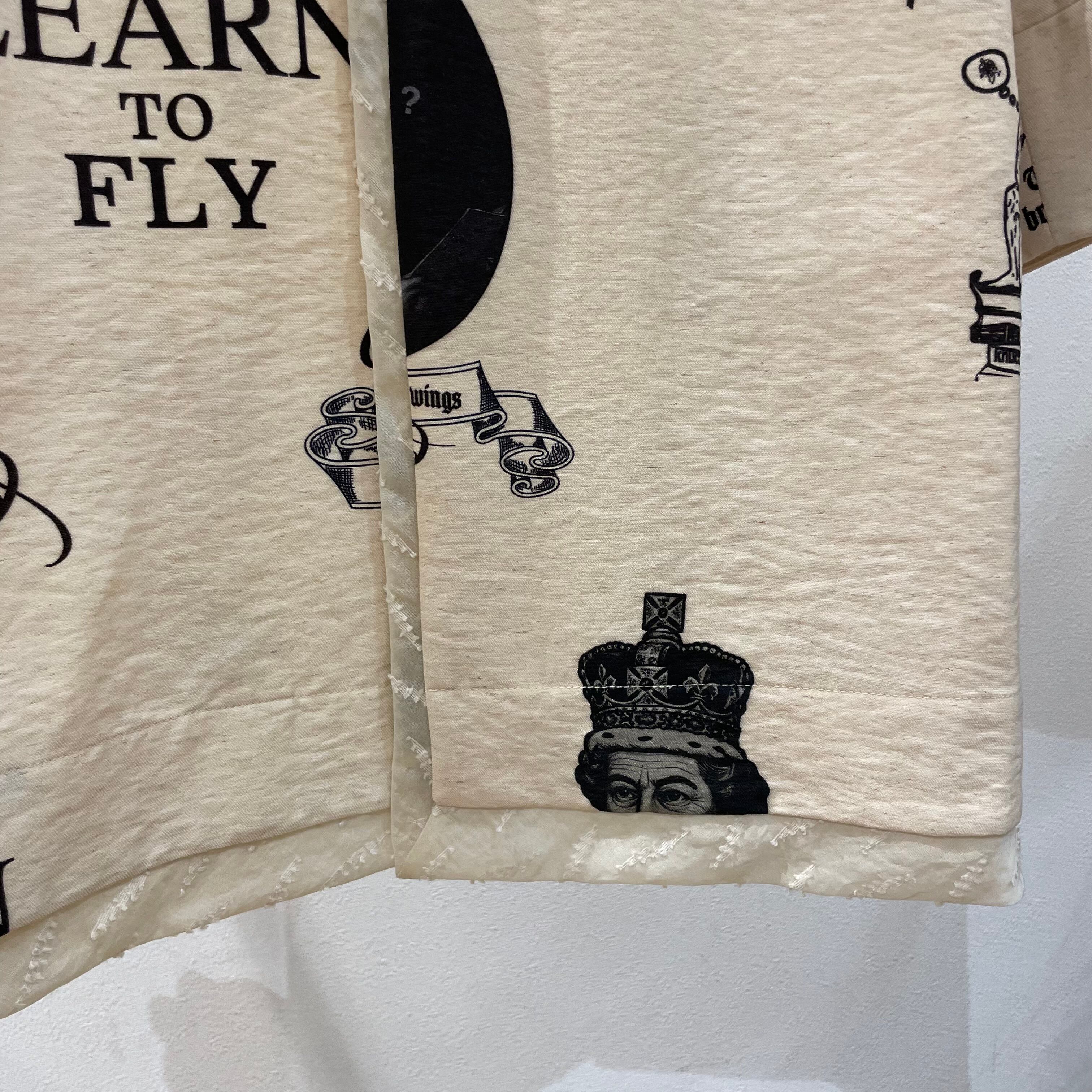 オリジナルテキスタイルでは、リネンのような見え方のコットンリネンナイロンの混紡の素材にブラックで様々なプリントを入れてみました。そして、女性で女王として政治にも参加した歴史上の偉大な人物、憧れのヴィクトリア女王とエリザベス2世のイラストを作成してみました。二人共が70年ほど英国を治世した人物。特にヴィクトリア女王は19世紀にアートや産業革命など、発展に努め社会的基盤を築いた人物です。彼女等も沢山の疑問や知識を学びながら努力した事であろうと想像をしながら、このグラフィックを作りました。また、STUDYと描いたイラストは、勉強を頑張るのを先延ばしにするかどうしようかを考える男性です。努力するかどうかの葛藤のイメージ。