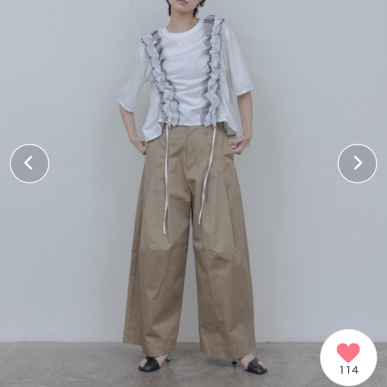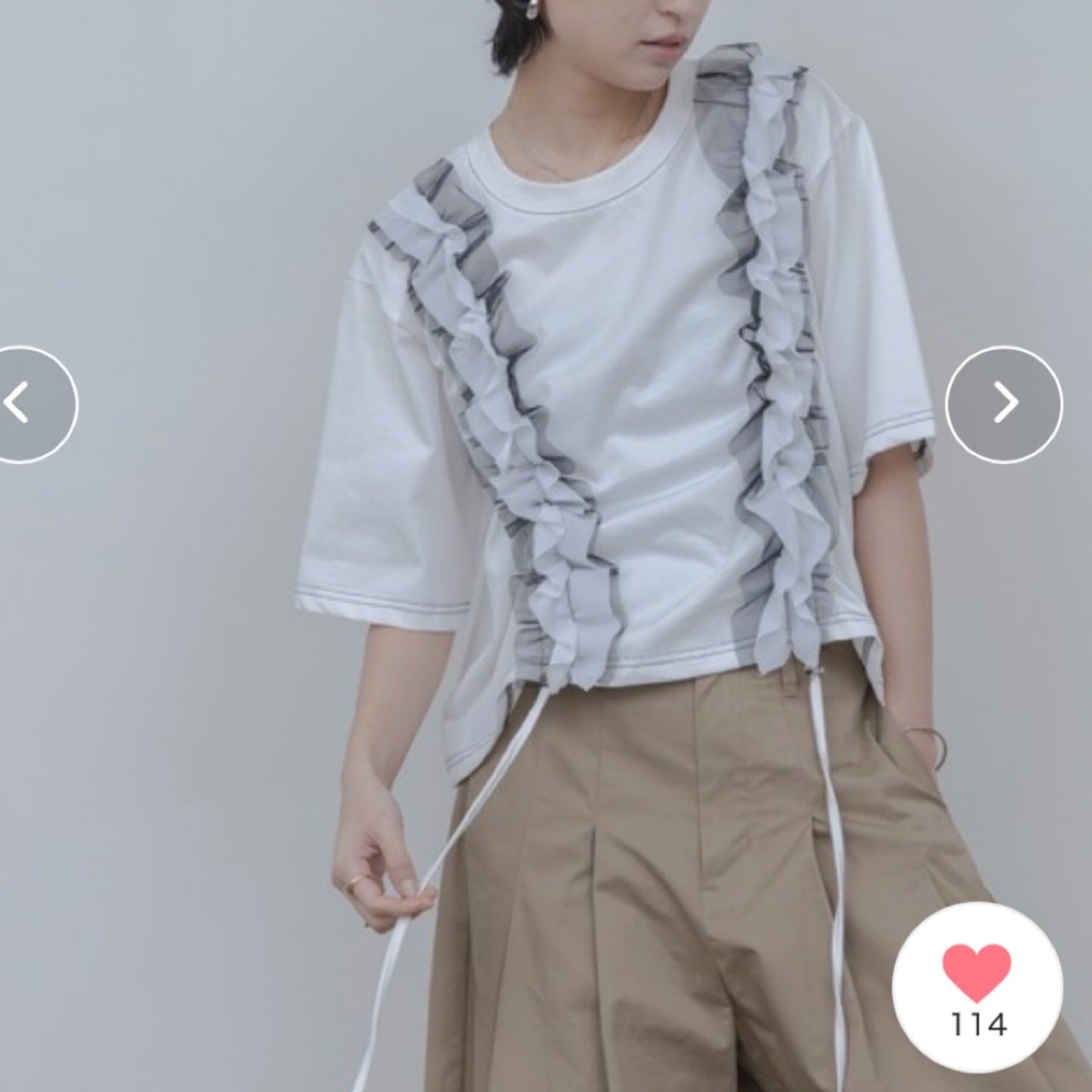 イージーなTシャツに軽やかなフリルをONすることで、涼しさもありながら一気に華やかで着映え感を感じる1着です。