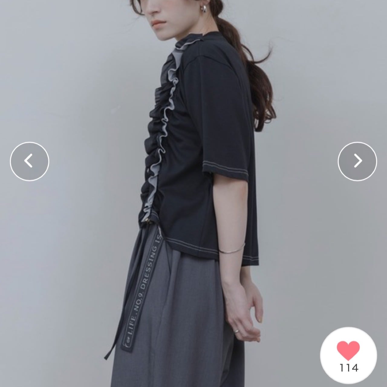 ドロストでフリルの位置、丈感を調整できるのでボトムや身長によってお好みのバランスで着用できる優秀トップス。