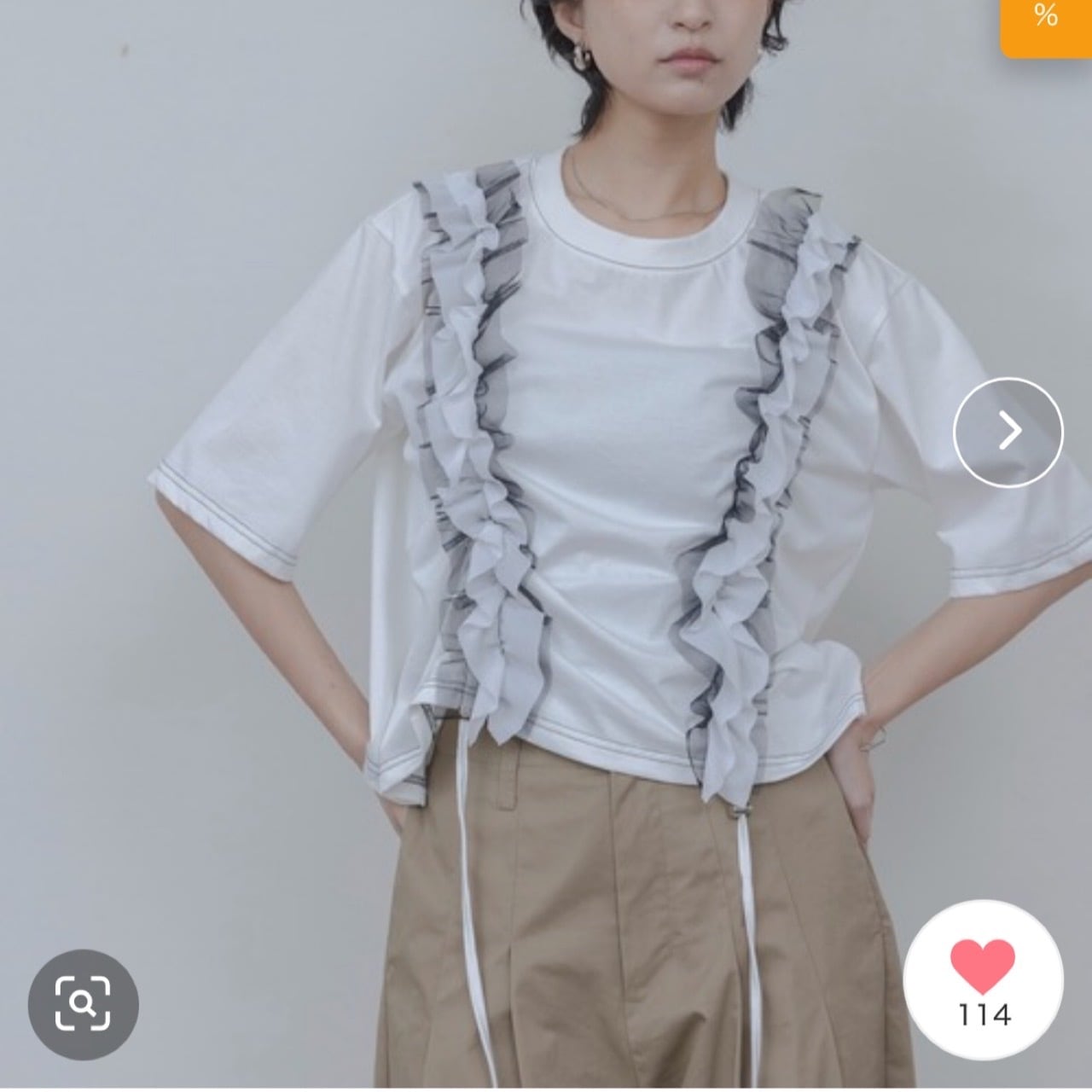 大胆な配色フリルが目を引くデザインTシャツ。