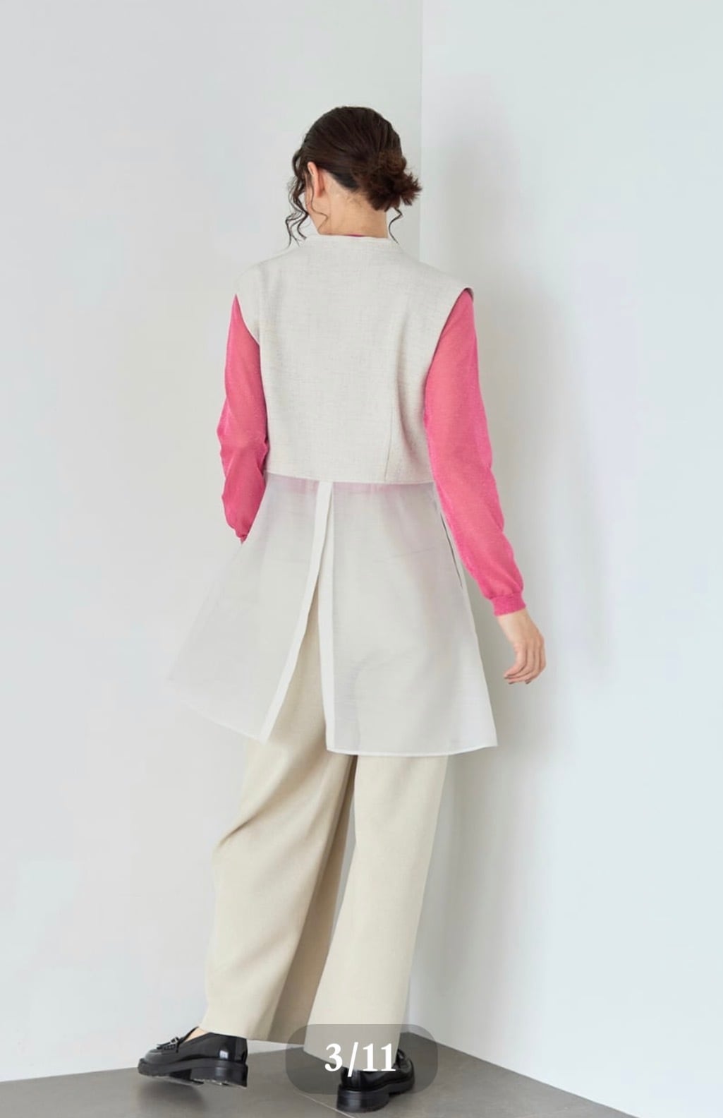 表情のあるTRスラブツイードと、シアー感のある軽やかなシフォン素材をドッキングした、レイヤード見えのロング丈ジレ。