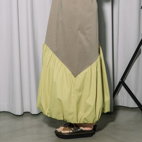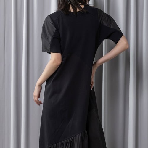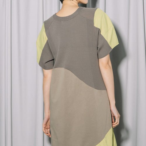 上身頃は柔らかなニット、身頃は着心地の良い天竺、裾にはハリのあるタフタを組み合わせた異素材デザインワンピース。