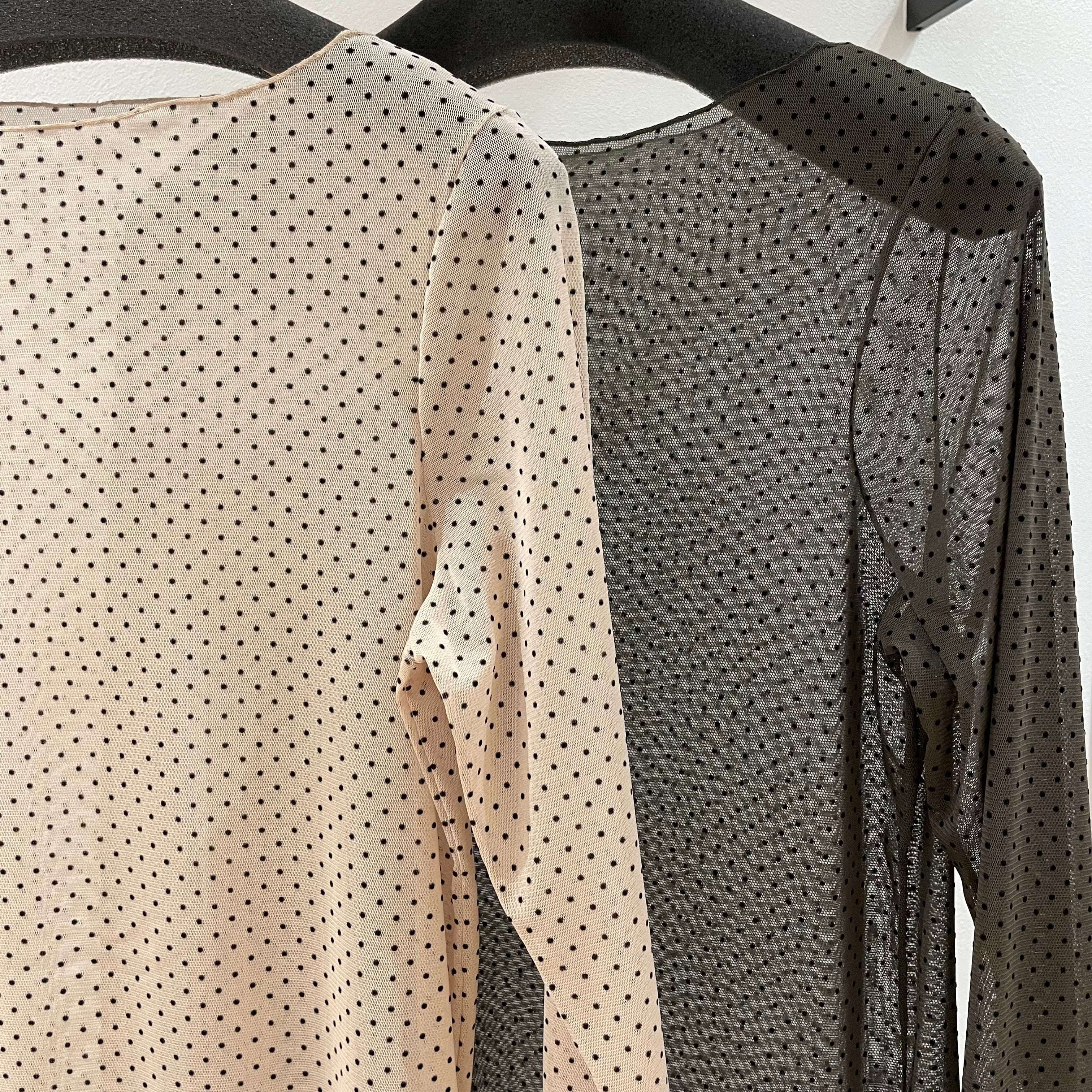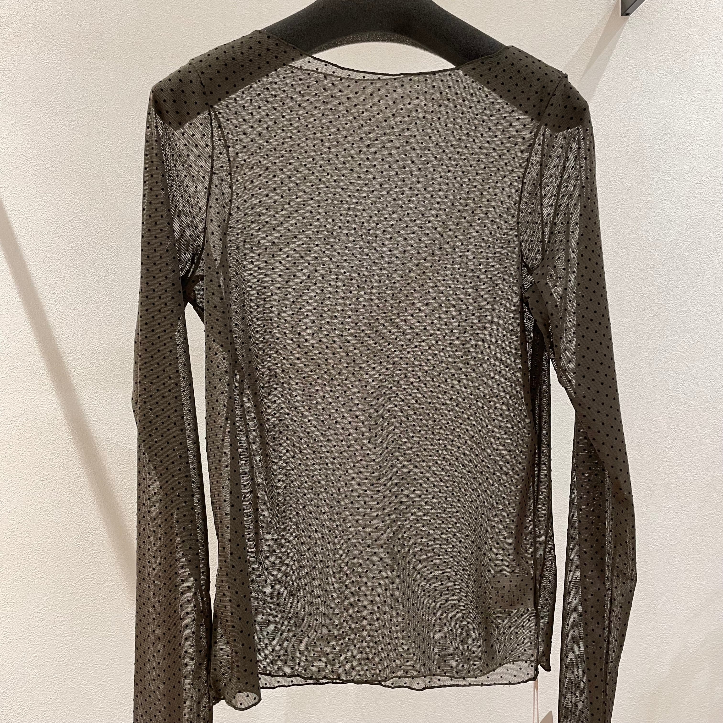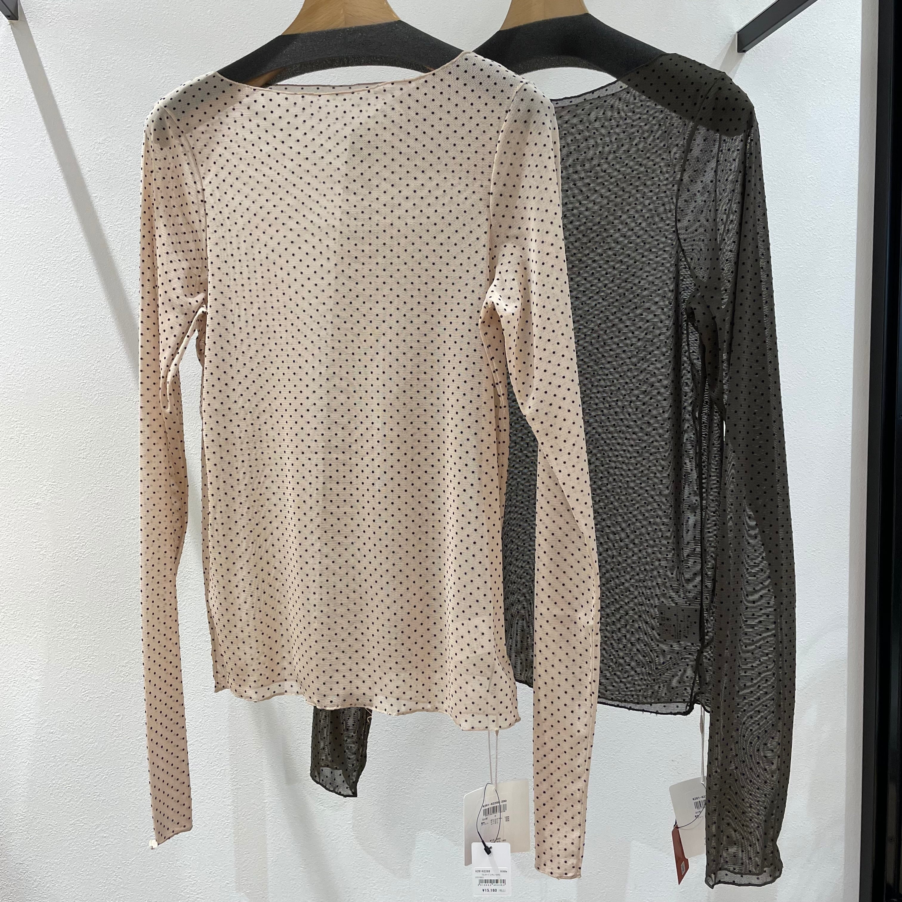 フロッキードット模様が魅力のチュール素材のプルオーバーです。軽やかで柔らかな質感が、肌に優しく、着心地抜群。デイリーユースにぴったりな一着です。透け感があり、レイヤードスタイルを楽しむことも可能です。特別な日にも、カジュアルなシーンにも幅広く活躍してくれるアイテムです。